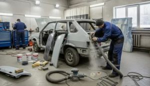 После согласования приступают к подготовке: демонтаж повреждённых деталей, удаление старой краски и коррозии, выправление вмятин, при необходимости — сварка. Здесь важен навык и подход: экономия на технологии часто приводит к повторным проблемам.