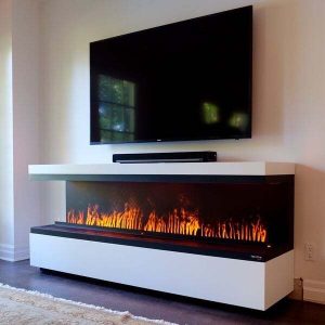 В основе парового камина лежит генератор холодного пара: тонкая водяная взвесь подсвечивается LED-элементами, что создает впечатляющее, живое пламя. Эффект усиливают звук и мерцание — все вместе воспринимается как настоящий очаг, хотя нагрева практически нет.